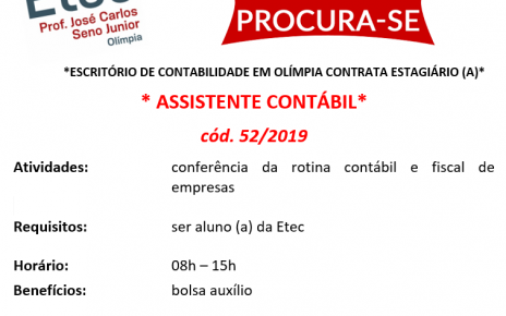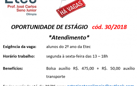 Enviar currículo até dia 04/06 para: estagioetecolimpia@outlook.com citando o código 31 no campo assunto.