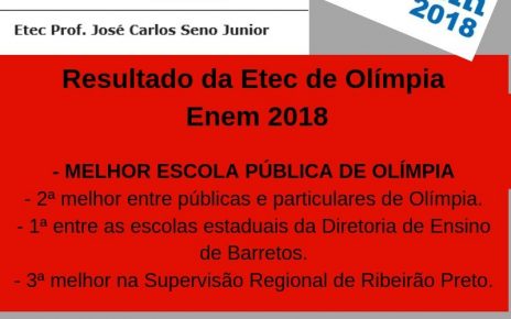 Compartilhe com seus amigosDesde 2013 a Etec Professor José Carlos Seno Júnior em Olímpia participa efetivamente do Exame Nacional do Ensino Médio (ENEM), mantendo resultados que demonstram a qualidade do ensino oferecido na instituição. Mais um ano a Escola Técnica Estadual se destaca, com 100% de taxa de participação (114 alunos) que participaram do processo […]