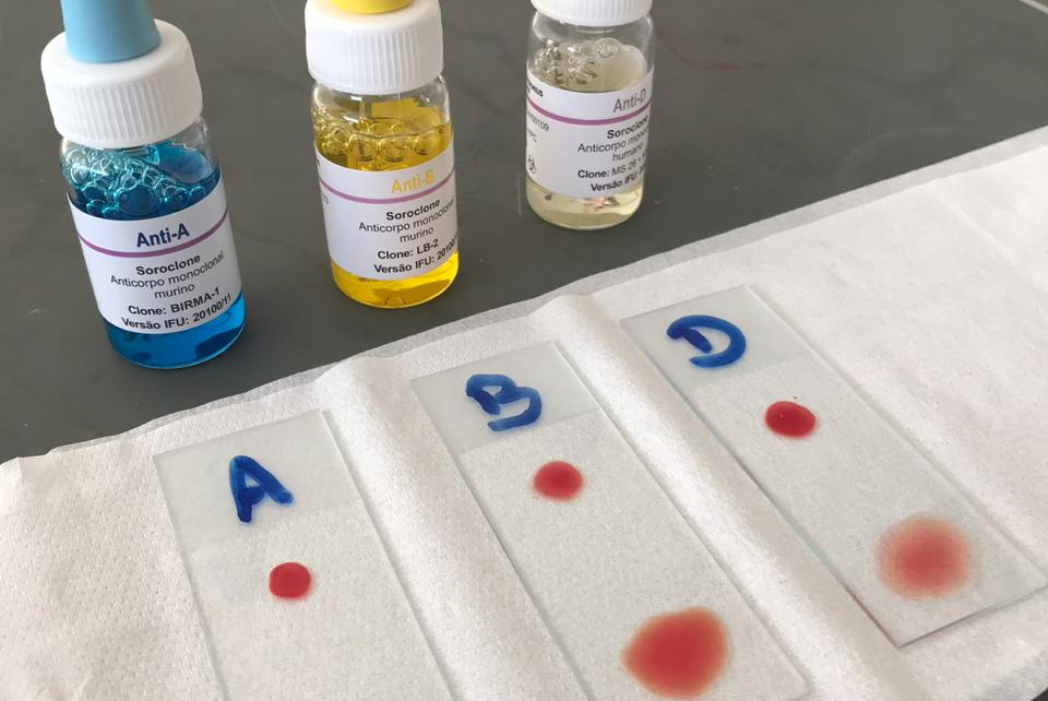 Os alunos aprenderam sobre o teste realizado para estabelecer qual o tipo sanguíneo e fator Rh que o indivíduo possui, observando a aglutinação.