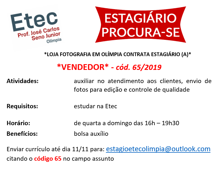 Compartilhe com seus amigosCurso Técnico em Logística, Química e Recursos Humanos A ESCOLA TÉCNICA ESTADUAL PROF. JOSÉ CARLOS SENO JUNIOR, município de Olímpia atendendo odisposto no § 3.º do Artigo 72 do Regimento Comum das Escolas Técnicas Estaduais do Centro Estadualde Educação Tecnológica Paula Souza, torna pública a abertura do Processo Especial de Seleção deCandidatos […]