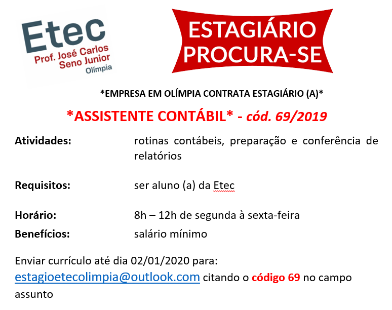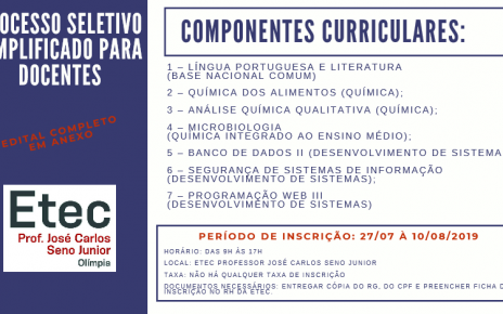 Compartilhe com seus amigosESCOLA TÉCNICA ESTADUAL PROFESSOR JOSÉ CARLOS SENO JUNIOR – OLÍMPIA – UNIDADE 232 EDITAL DE ABERTURA DE INSCRIÇÕES AO PROCESSO SELETIVO SIMPLIFICADO PARA FORMAÇÃO DE CADASTRO RESERVA, PARA PROFESSOR DE ENSINO MÉDIO E TÉCNICO, Nº 232/03/2019 O Diretor da ESCOLA TÉCNICA ESTADUAL PROFESSOR JOSÉ CARLOS SENO JUNIOR, da cidade de OLÍMPIA, à vista […]