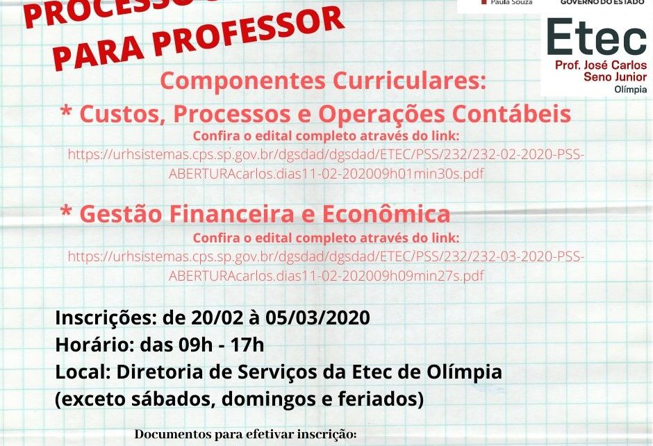Link do edital: https://urhsistemas.cps.sp.gov.br/dgsdad/dgsdad/ETEC/PSS/232/232-02-2020-PSS-ABERTURAcarlos.dias11-02-202009h01min30s.pdf