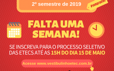 Compartilhe com seus amigosInscrições Vagas Remanescentes para as 2ª Série do Mtec em Administração (noturno), Desenvolvimento de Sistemas (noturno), Química (noturno e Integral). Inscrições de 06/01/2026 a 30/01/2026 na secretaria da Etec das 09h00 até 15h00DOCUMENTAÇÃO NECESSÁRIA: CÓPIA RG, CPF E DECLARAÇÃO DE MATRÍCULA NA 2ª SÉRIE DO ENSINO MÉDIOPROVA 1ª FASE: 06/02/2025 às 13h00 […]