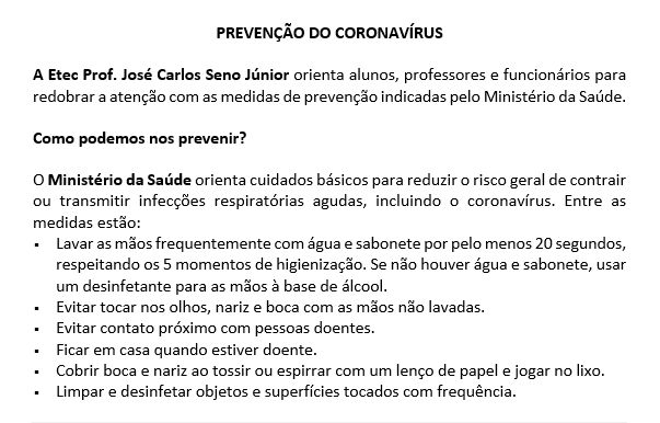 A Etec Prof. José Carlos Seno Júnior orienta alunos, professores e funcionários para redobrar a atenção com as medidas de prevenção indicadas pelo Ministério da Saúde.