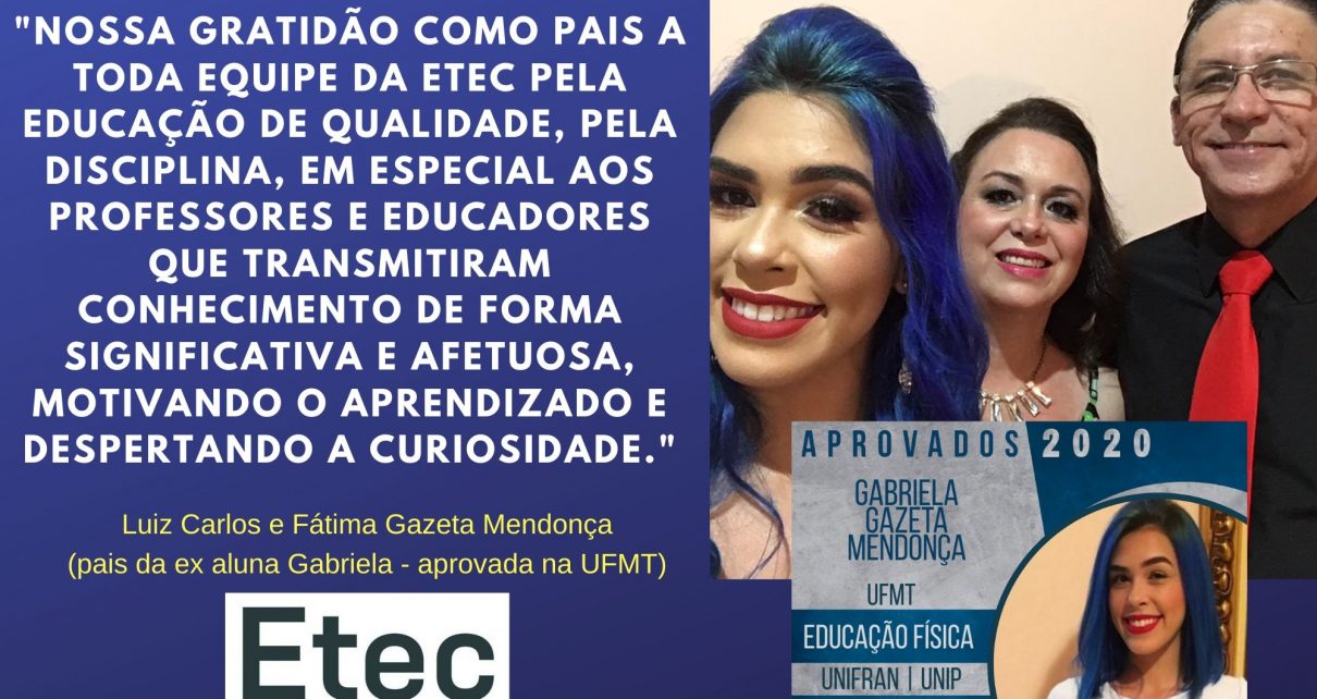 Nossa gratidão como pais a toda equipe da ETEC pela educação de qualidade, pela disciplina, em especial aos professores e educadores que transmitiram conhecimento de forma significativa e afetuosa, motivando o aprendizado e despertando a curiosidade.