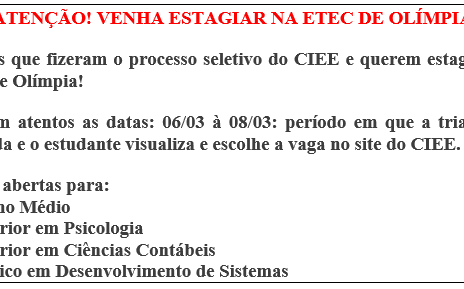 A ESCOLA TÉCNICA ESTADUAL Prof. José Carlos Seno Junior, município de Olímpia atendendo o disposto no § 3.º do Artigo 62 do Regimento Comum das Escolas Técnicas Estaduais do Centro Estadual de Educação Tecnológica Paula Souza, torna pública a abertura do Processo Especial de Seleção de Candidatos para preenchimento de vagas remanescentes do Curso Técnico em Serviços Jurídicos, para o 1º Módulo referente ao 1º semestre 2021.