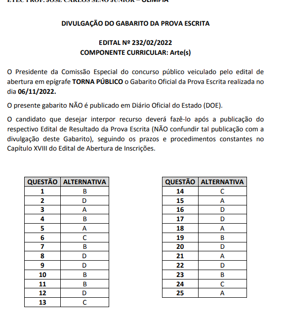 CENTRO PAULA SOUZACONCURSO PÚBLICO PARAPROFESSOR DE ENSINO MÉDIO E TÉCNICOETEC PROF. JOSÉ CARLOS SENO JUNIOR – OLÍMPIADIVULGAÇÃO DO GABARITO DA PROVA ESCRITAEDITAL Nº 232/02/2022COMPONENTE CURRICULAR: Arte(s) O Presidente da Comissão Especial do concurso público veiculado pelo edital deabertura em epígrafe TORNA PÚBLICO o Gabarito Oficial da Prova Escrita realizada nodia 06/11/2022.O presente gabarito NÃO é […]