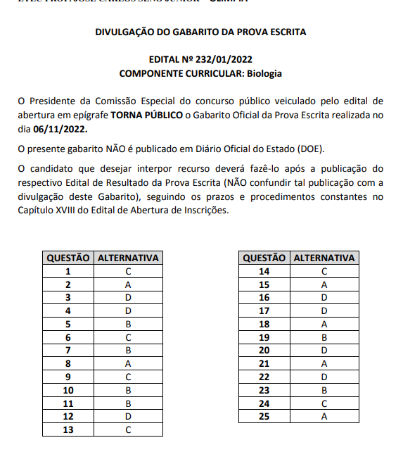 CENTRO PAULA SOUZACONCURSO PÚBLICO PARAPROFESSOR DE ENSINO MÉDIO E TÉCNICOETEC PROF. JOSÉ CARLOS SENO JUNIOR – OLÍMPIADIVULGAÇÃO DO GABARITO DA PROVA ESCRITAEDITAL Nº 232/01/2022COMPONENTE CURRICULAR: Biologia O Presidente da Comissão Especial do concurso público veiculado pelo edital deabertura em epígrafe TORNA PÚBLICO o Gabarito Oficial da Prova Escrita realizada nodia 06/11/2022.O presente gabarito NÃO é […]