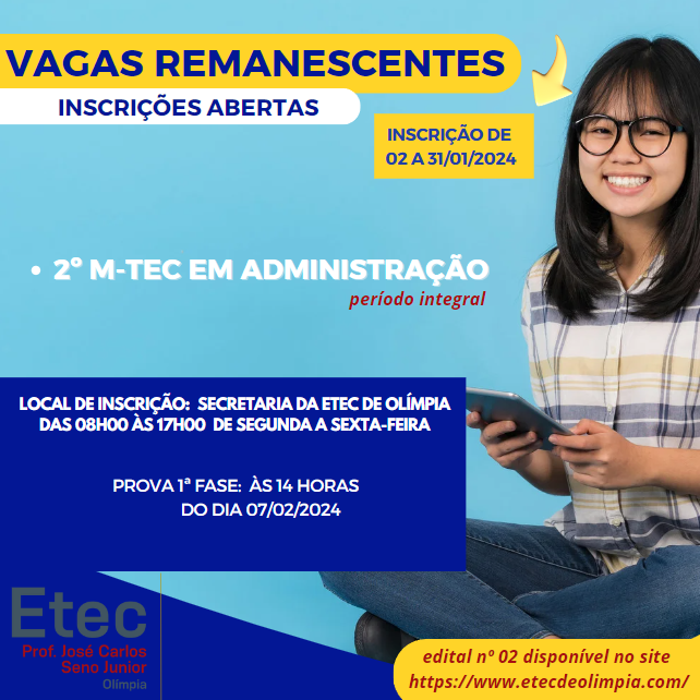 A Escola Técnica Estadual Prof. José Carlos Seno Junior, atendendo o disposto no § 3.º do Artigo 62 do Regimento Comum das Escolas Técnicas Estaduais do Centro Estadual de Educação Tecnológica Paula Souza, torna pública a abertura de inscrições para o Processo Especial de Seleção de Candidatos para o Preenchimento de vagas remanescentes da segunda (2ª) série do Ensino Médio com Habilitação Profissional de Técnico em Administração