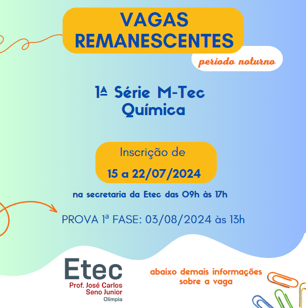 (1ª) série do Ensino Médio com Habilitação Profissional de Técnico em Química – Período Noturno, para o ano letivo de 2024. EDITAL n.º 07, de 15/07/2024A Escola Técnica Estadual Prof. José Carlos Seno Junior, atendendo o disposto no § 3.º do Artigo 62 do Regimento Comum das Escolas Técnicas Estaduais do Centro Estadual de Educação […]