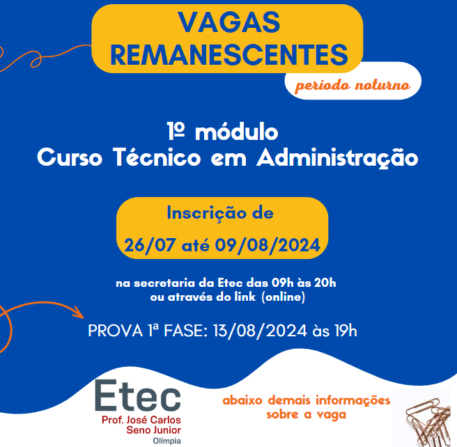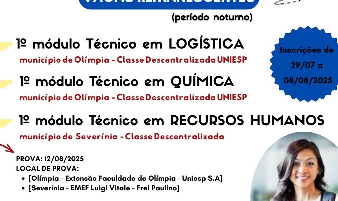 Curso Técnico em Administração, noperíodo Noturno com ingresso no 1º Módulo do 2º Semestre de 2024 EDITAL n.º 08, de 25/07/2024A ESCOLA TÉCNICA ESTADUAL PROF. JOSÉ CARLOS SENO JUNIOR, município de Olímpia atendendo odisposto no § 3.º do Artigo 72 do Regimento Comum das Escolas Técnicas Estaduais do Centro Estadualde Educação Tecnológica Paula Souza, torna […]