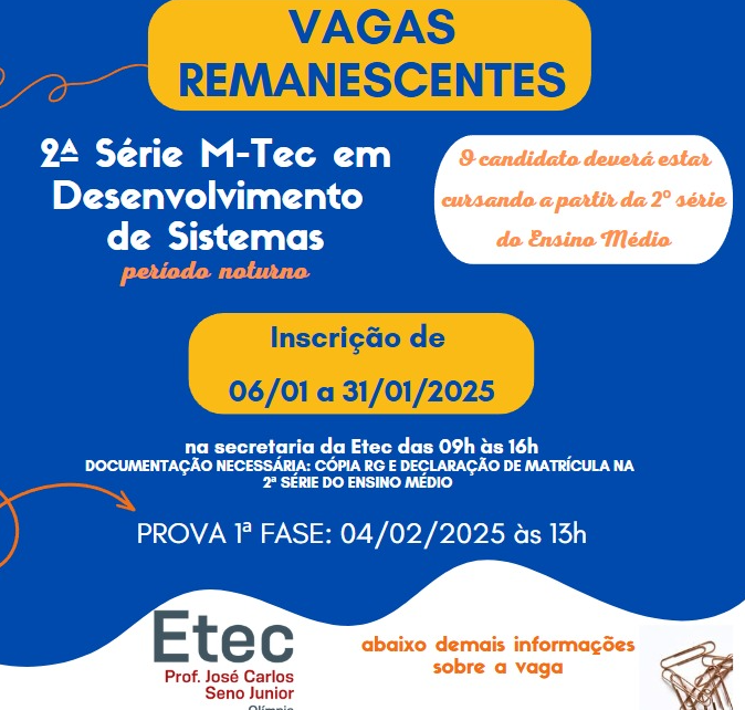 Inscrições de 06/01/2025 a 31/01/2025 na secretaria da Etec das 09h00 às 16h00 DOCUMENTAÇÃO NECESSÁRIA: CÓPIA RG E DECLARAÇÃO DE MATRÍCULA NA 2ª SÉRIE DO ENSINO MÉDIO PROVA 1ª FASE: 04/02/2025 às 13h00 – na Etec Prof. José Carlos Seno Junior, apresentar o RG original EDITAL n.º 01, de 02/01/2025 A Escola Técnica Estadual Prof. […]