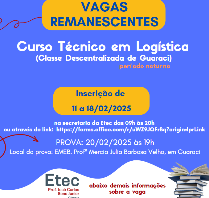 VAGAS REMANESCENTES – CURSO TÉCNICO EM LOGÍSTICA (CLASSE DESCENTRALIZADA DE GUARACI)