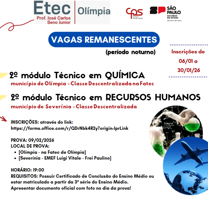 Inscrições Vagas Remanescentes para as 2ª Série do Mtec em Administração (noturno), Desenvolvimento de Sistemas (noturno), Química (noturno e Integral). Inscrições de 06/01/2026 a 30/01/2026 na secretaria da Etec das 09h00 até 15h00DOCUMENTAÇÃO NECESSÁRIA: CÓPIA RG, CPF E DECLARAÇÃO DE MATRÍCULA NA 2ª SÉRIE DO ENSINO MÉDIOPROVA 1ª FASE: 06/02/2025 às 13h00 – na Etec […]