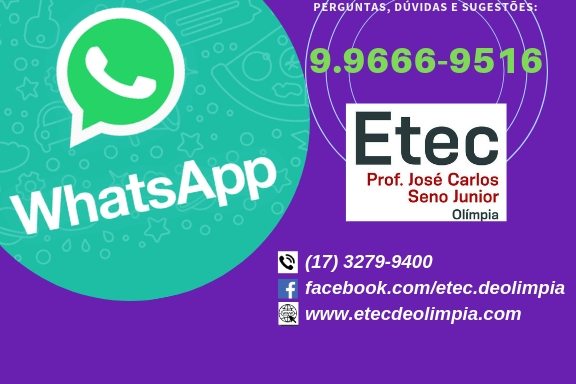 O WhatsApp é o canal de interação com a comunidade e através deste aplicativo de mensagens instantâneas a instituição responde dúvidas, informa sobre os cursos e processos seletivos. WhatsApp Etec Olímpia: (17) 9.9666-9516 A escola está presente também em outras redes sociais: o site www.etecdeolimpia.com e a página facebook.com/etec.deolimpia Serão bem-vindos comentários e perguntas, desde […]