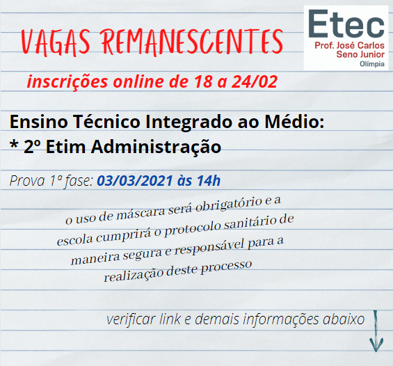 VAGAS REMANESCENTES: INSCRIÇÕES DE 18 a 24/02 PARA INGRESSAR NO 2º ETIM DE ADMINISTRAÇÃO (PERÍODO DIURNO)