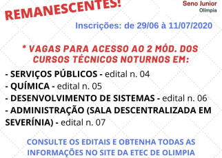 Inscrições Vagas Remanescentes para as 2ª Série do Mtec em Administração (noturno), Desenvolvimento de Sistemas (noturno), Química (noturno e Integral). Inscrições de 06/01/2026 a 30/01/2026 na secretaria da Etec das 09h00 até 15h00DOCUMENTAÇÃO NECESSÁRIA: CÓPIA RG, CPF E DECLARAÇÃO DE MATRÍCULA NA 2ª SÉRIE DO ENSINO MÉDIOPROVA 1ª FASE: 06/02/2025 às 13h00 – na Etec […]