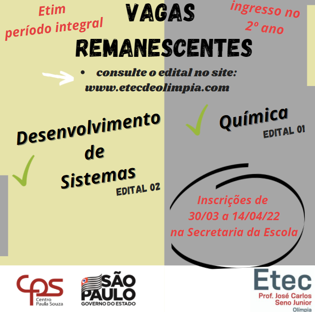 Inscrição na secretaria da Etec Prof. José Carlos Seno Junior, das 09h00 às 20h00, de segunda a sexta-feira. PROVA 1ª FASE : 25/04/2022, às 14h30 NA ETEC CONTEÚDO PROGRAMÁTICO DESENVOLVIMENTO DE SISTEMAS: Ensino Médio: 3º e 4º bimestre da 1ª série do Ensino Médio / Parte Técnica: Microsoft Office, Internet, Banco de Dados, Lógica de […]
