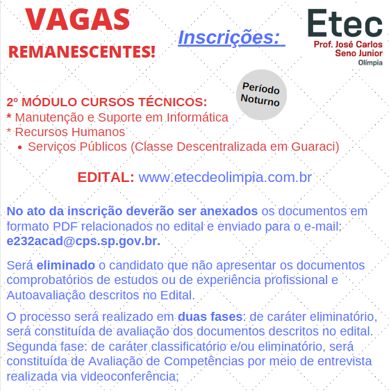 EDITAL n.º 01, de 04/01/2021 Extraordinário – 1º Semestre 2021 A ESCOLA TÉCNICA ESTADUAL PROF. JOSÉ CARLOS SENO JUNIOR, município de Olímpia atendendo o disposto no § 3.º do Artigo 62 do Regimento Comum das Escolas Técnicas Estaduais do Centro Estadual de Educação Tecnológica Paula Souza, torna pública a abertura do Processo Extraordinário de Seleção […]