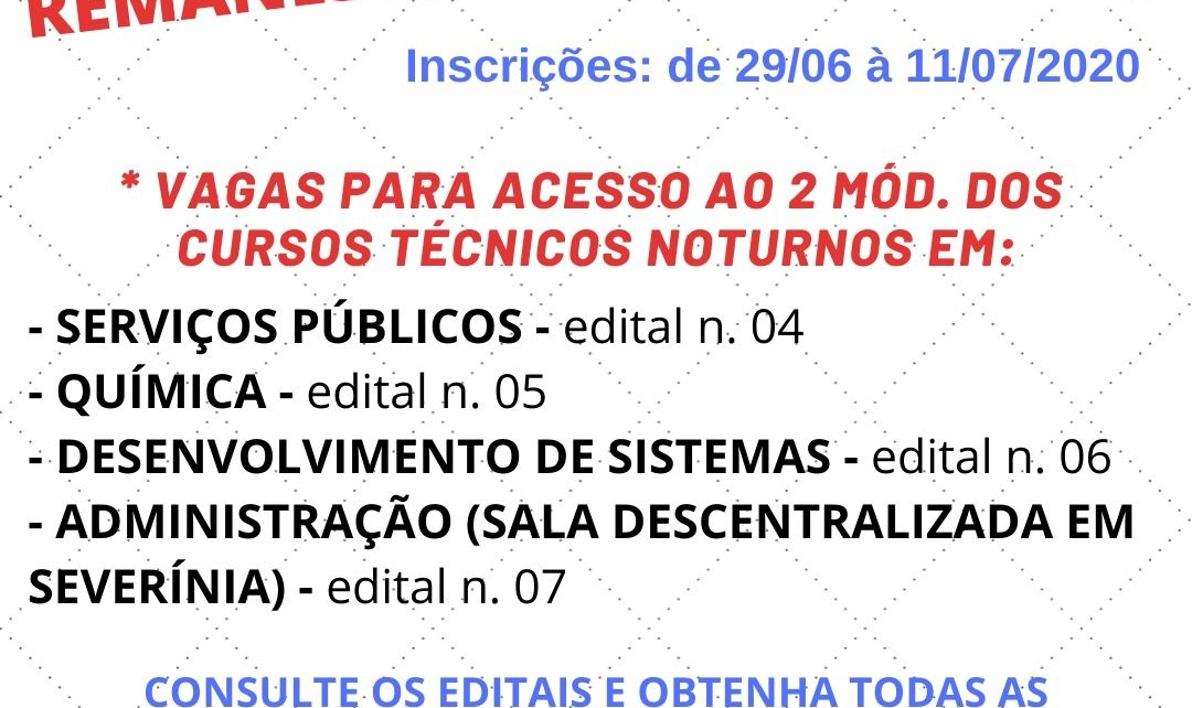 VAGAS REMANESCENTES PARA O 2 MODULO DO TÉCNICO EM: ADMINISTRAÇÃO (CLASSE DESCENTRALIZADA DE SEVERÍNIA), DESENVOLVIMENTO DE SISTEMAS, QUÍMICA E SERVIÇOS PÚBLICOS. EDITAL n.º 04, 05, 06 e 07, de 25/06/2020 A ESCOLA TÉCNICA ESTADUAL PROF. JOSÉ CARLOS SENO JUNIOR, município de Olímpia atendendo o disposto no § 3.º do Artigo 62 do Regimento Comum […]