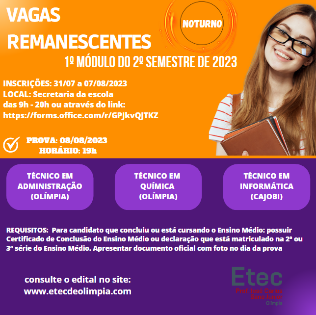 TÉCNICO EM ADMINISTRAÇÃO – OLÍMPIATÉCNICO EM QUÍMICA – OLÍMPIATÉCNICO EM INFORMÁTICA – CAJOBI INSCRIÇÕES: 31/07/2023 a 07/08/2023 As inscrições deverão ser efetuadas pelo candidato, no horário das 09h00 às 20h00 na secretaria da Etec Prof. José Carlos Seno Junior ou através do link:https://forms.office.com/Pages/ResponsePage.aspx?id=bEY47UG2fUOa6dgBuCn6lIIBY0Wy9MhGjS3-efuSvClUN1NCTUQ0WDNFS0FaS0tDM1JCMTU4MEU5Ni4u PROVA: 08/08/2023HORÁRIO: 19H00REQUISITOS: Para candidato que concluiu ou está cursando o Ensino […]