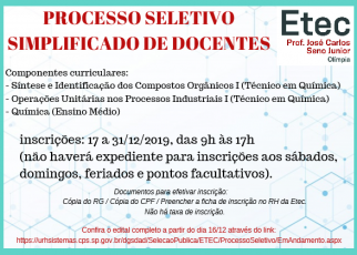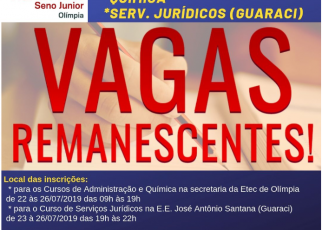 A ESCOLA TÉCNICA ESTADUAL Prof. José Carlos Seno Junior, município de Olímpia atendendo o disposto no § 3.º do Artigo 62 do Regimento Comum das Escolas Técnicas Estaduais do Centro Estadual de Educação Tecnológica Paula Souza, torna pública a abertura do Processo Especial de Seleção de Candidatos para preenchimento de vagas remanescentes do Curso Técnico […]