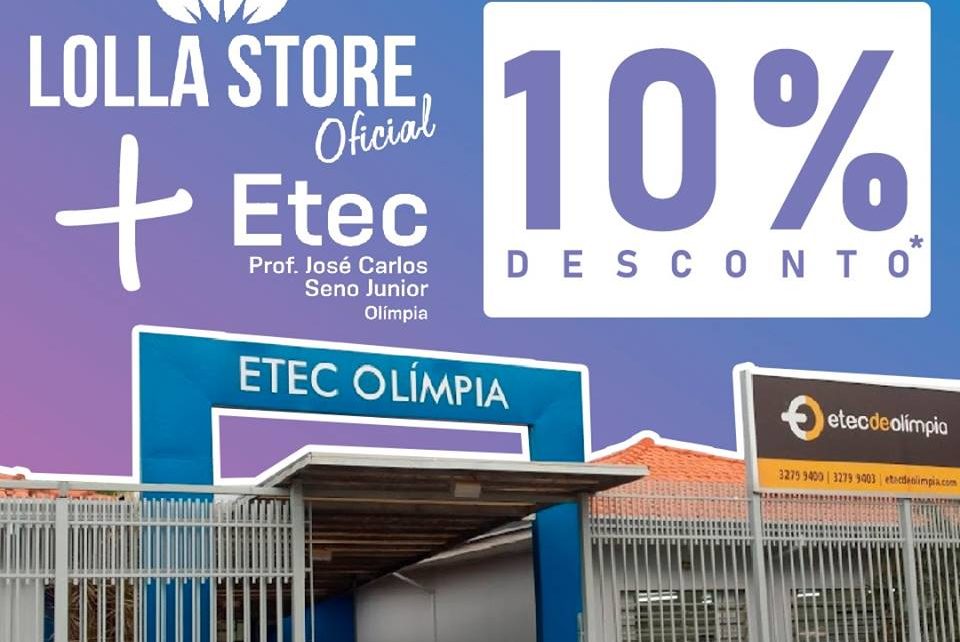LOLLA STORE – Rua São João, 490 – Olímpia – fone: (17) 3280-7209 Os descontos serão concedidos apenas aos alunos, professores e funcionários da Etec de Olímpia/SP. Para ter direito ao desconto deverá obrigatoriamente apresentar a Carteira de Identificação da escola ou Identificação Funcional (no caso dos funcionários e professores pode ser o holerite).