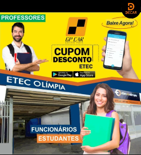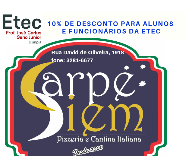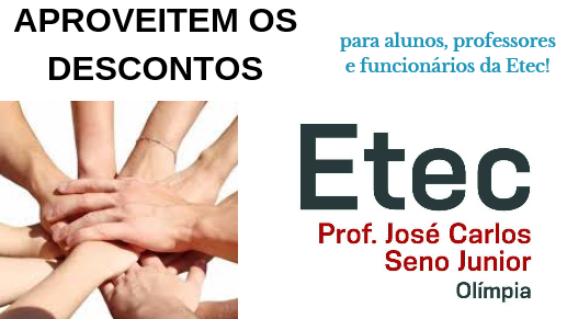 DESCONTO CONCEDIDO APENAS AOS ALUNOS, PROFESSORES E FUNCIONÁRIOS DA ETEC DE OLÍMPIA, MEDIANTE APRESENTAÇÃO DA CARTEIRA DE IDENTIFICAÇÃO DA ESCOLA.