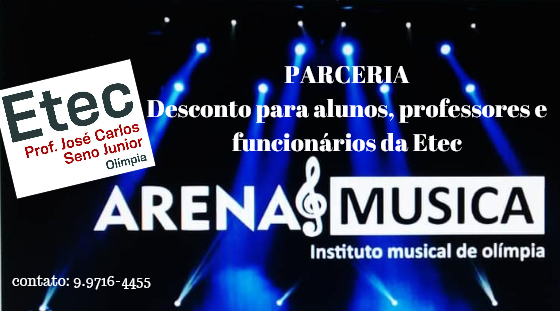 ARENA & MÚSICA INSTITUTO MUSICAL DE OLÍMPIA Praça Rui Barbosa, 76 (17) 9.9716-4455 das 13h – 21h Desconto para alunos, professores e funcionários da Etec Prof. José Carlos Seno Junior em Olímpia.