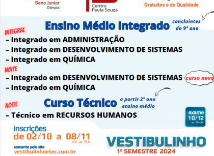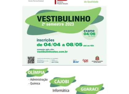 A Etec de Olímpia estabeleceu cooperação com empresas para dar desconto aos alunos, professores e funcionários. Basta apresentar a Carteira de Identificação da Escola, Identificação Funcional ou Holerite nas empresas parceiras. Conheça as empresas: – Academia Ellas’s: desconto de 10% na mensalidade com assinatura do contrato. Contato: 3279-7978 – ACG Idiomas: desconto de 25% na […]