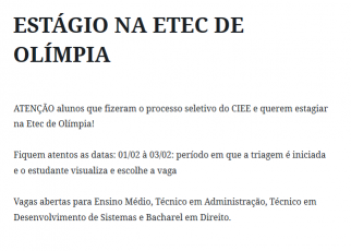 EDITAL n.º 02, de 10/02/2025A ESCOLA TÉCNICA ESTADUAL PROF. JOSÉ CARLOS SENO JUNIOR, município de Olímpia atendendo odisposto no § 3.º do Artigo 72 do Regimento Comum das Escolas Técnicas Estaduais do Centro Estadualde Educação Tecnológica Paula Souza, torna pública a abertura do Processo Especial de Seleção deCandidatos para preenchimento de vagas remanescentes do Curso […]
